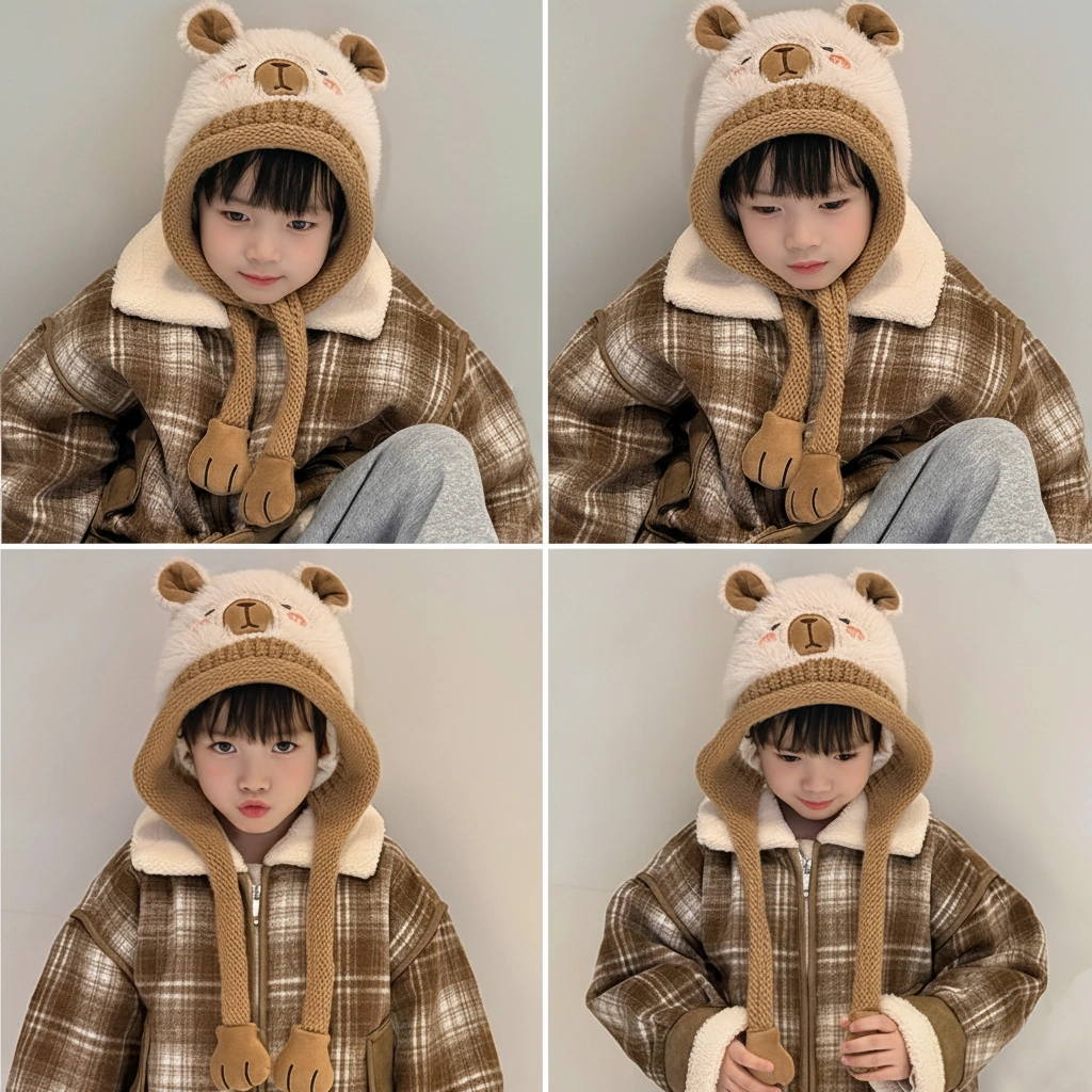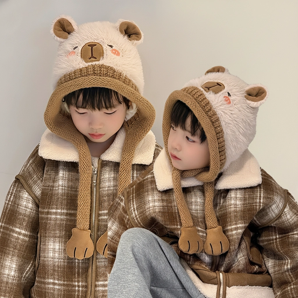 Cute Kids Capybara Beanie – Plush & Knit Winter Hood with Paw Earflaps (One Size)