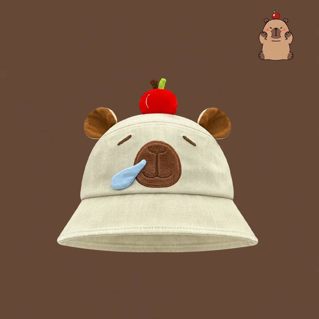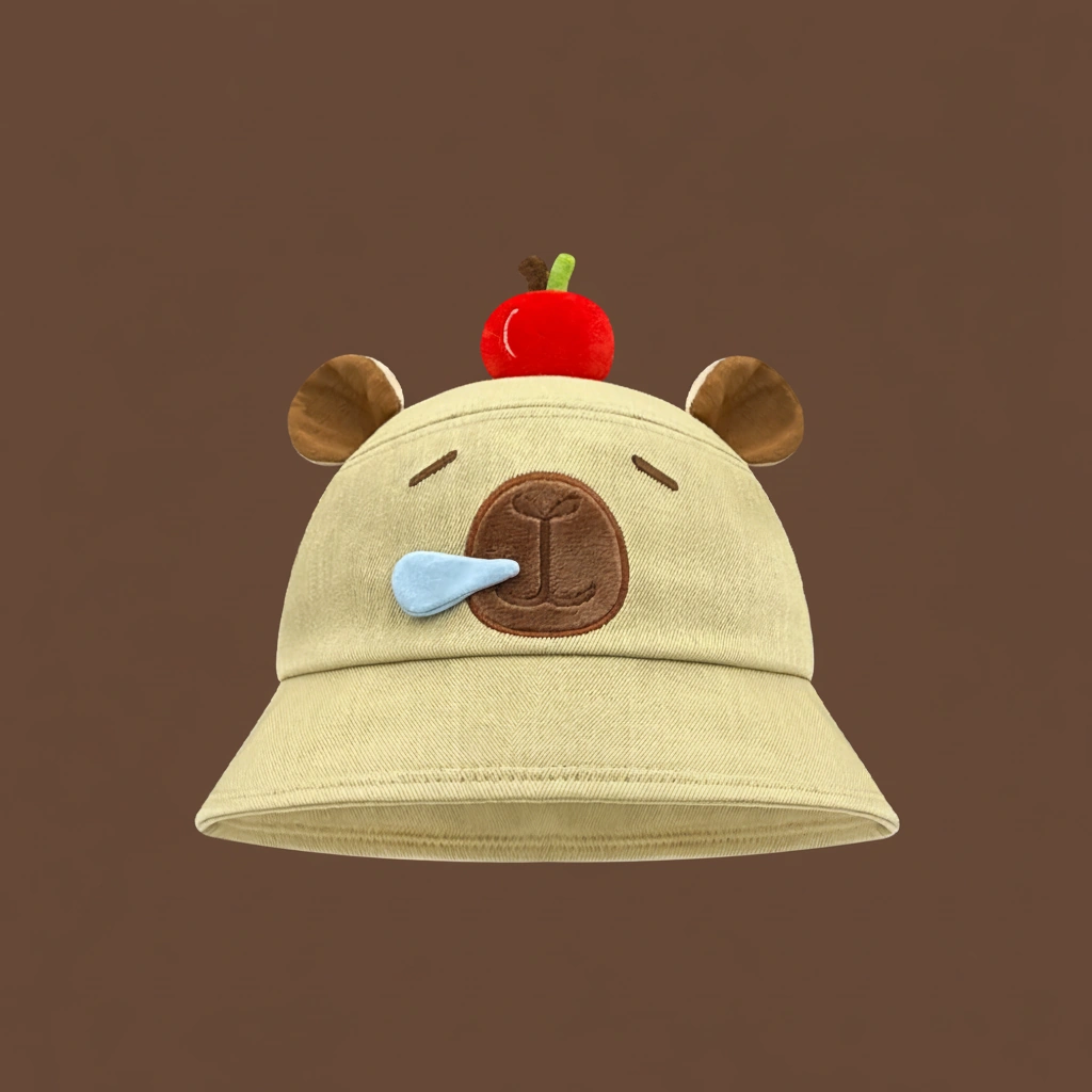 Adult Canvas Capybara Bucket Hat – Sleepy Face with 3D Red Apple (4 Colors)