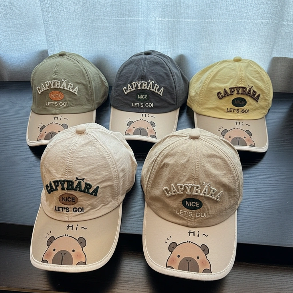 - The “Peeking” Brim: The contrast-colored brim showcases a cute cartoon capybara face looking up, adding a unique touch that kids love.