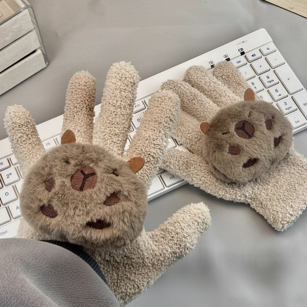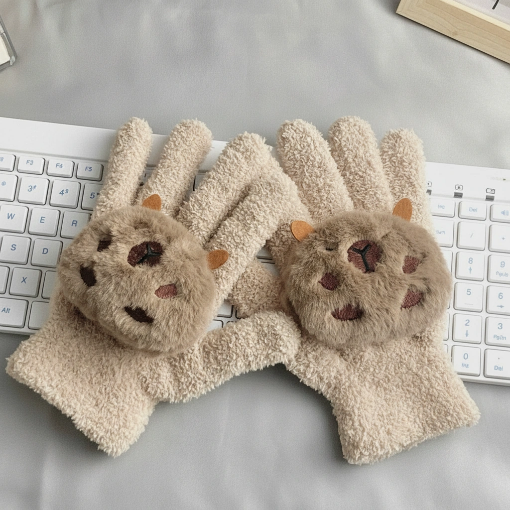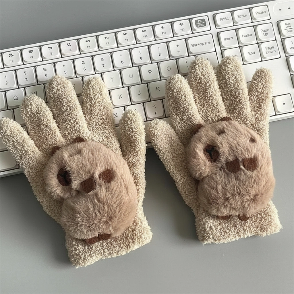 3D Capybara Plush Knitted Gloves – Winter Hand Warmers (Frontal & Side Profile Designs)