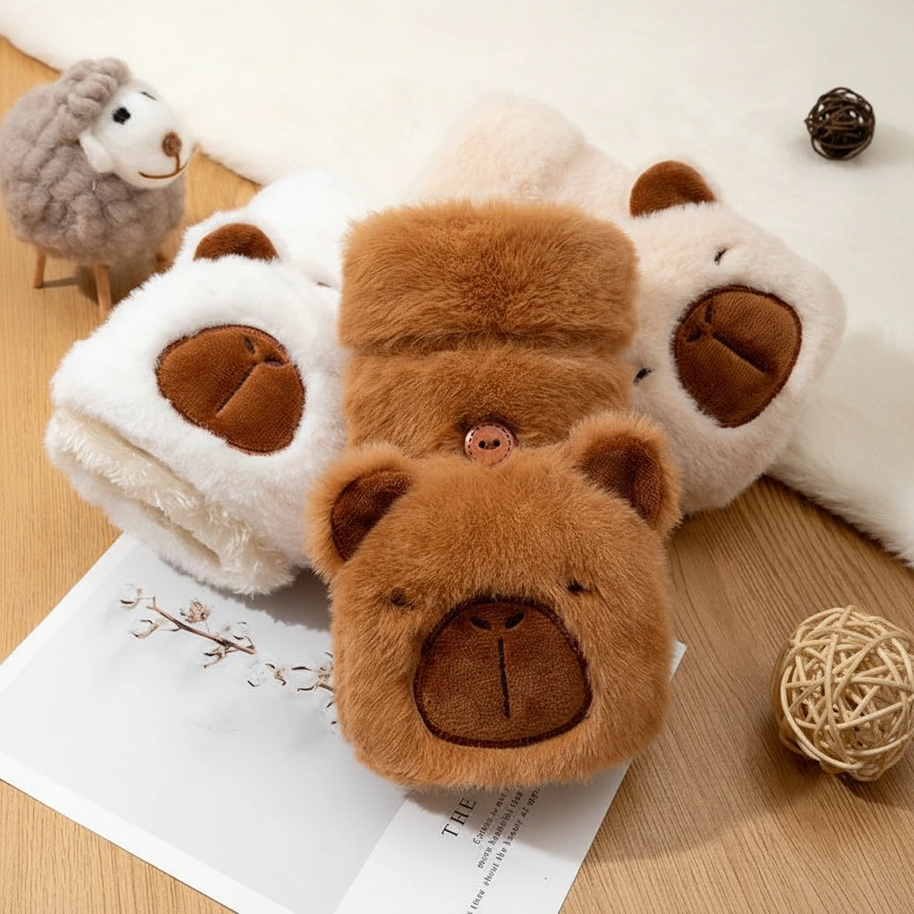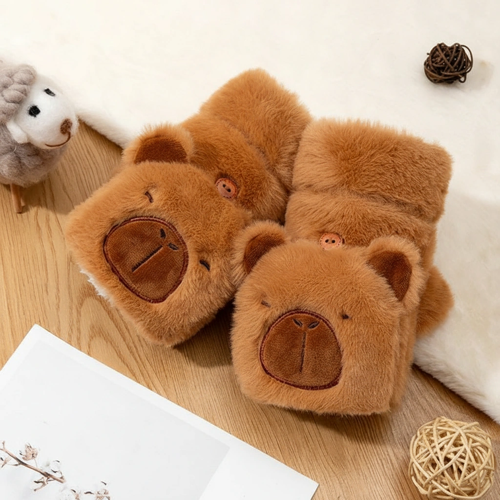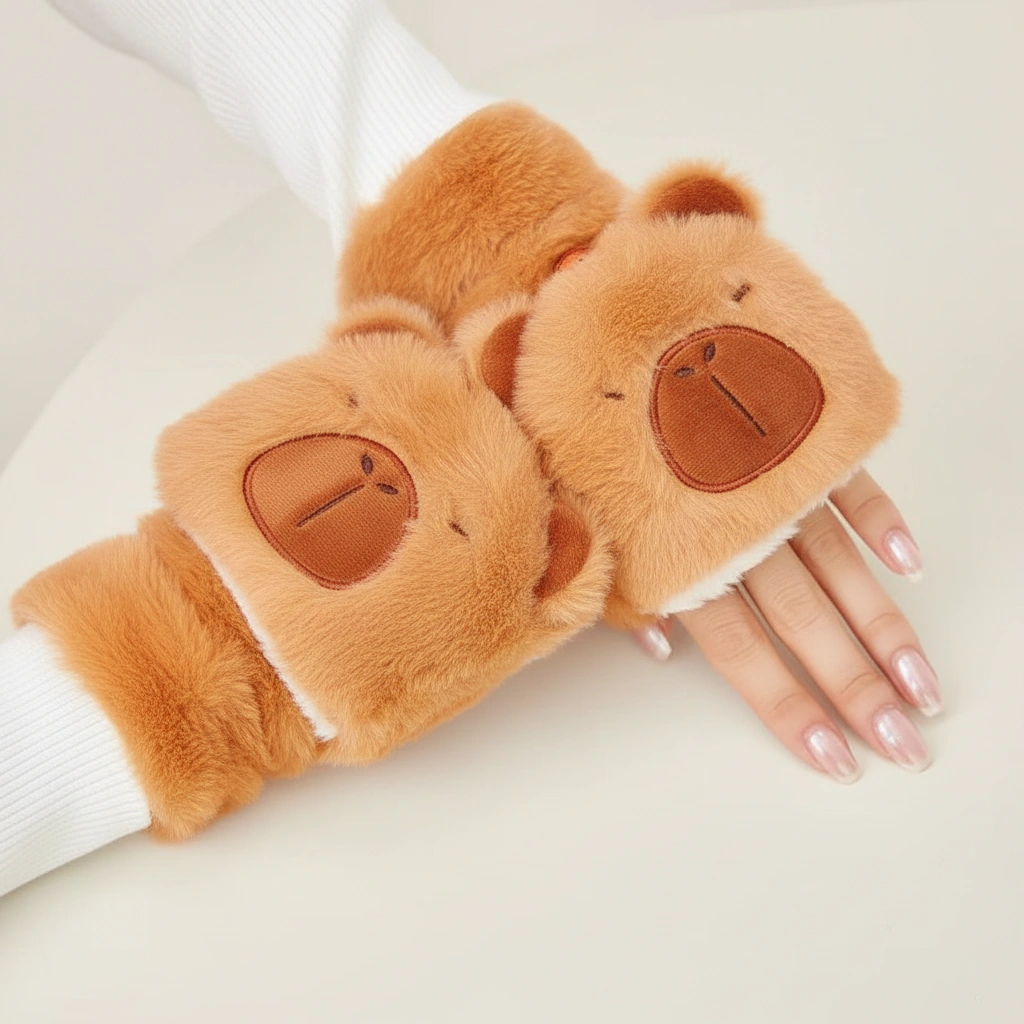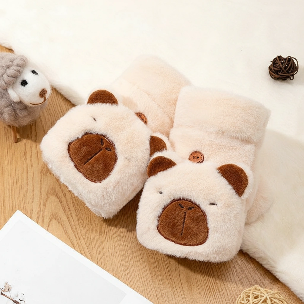 Adult Happy Capybara Mittens – Convertible Plush Gloves with Round Ears (3 Colors)