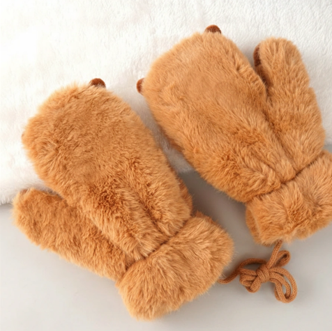 Kids Fluffy Capybara Mittens with Anti-Loss String – Winter Plush Gloves with Orange Detail (4 Colors)