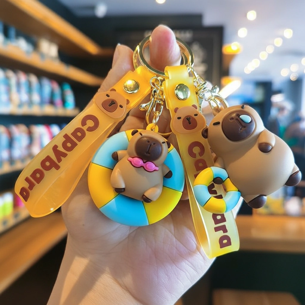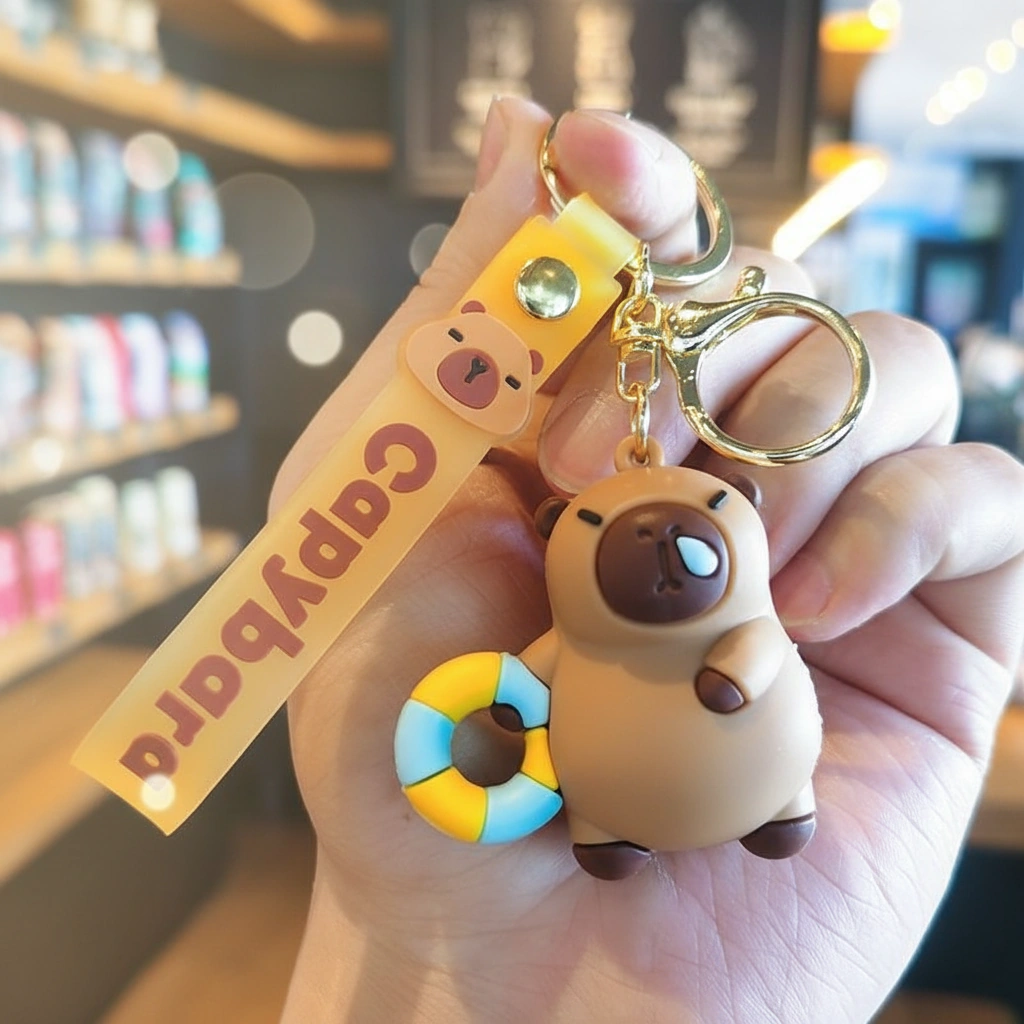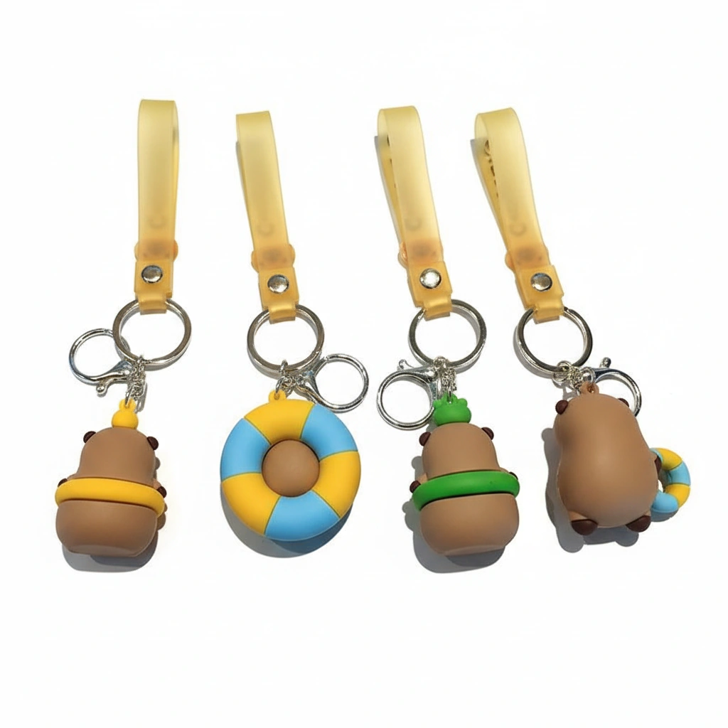 Cute Capybara Keychain with Strap – 3D PVC Cartoon Keyring – Frog, Duck, & Swim Ring Designs