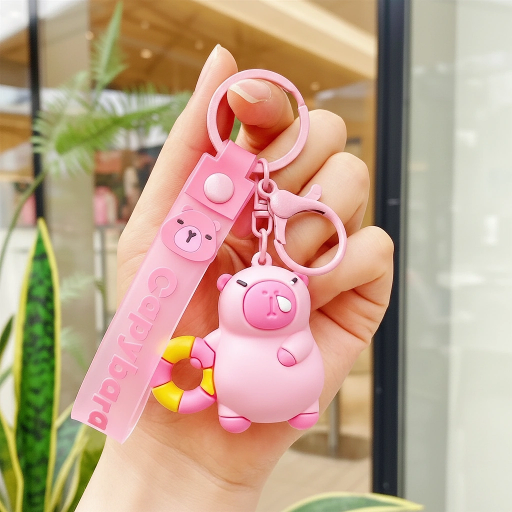 Premium Details Each keychain comes with a matching pink silicone strap embossed with “Capybara” text and a cute bear button detail. The high-quality pink hardware adds a cohesive, polished look that stands out.