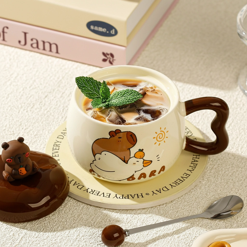 Every capybara mug in this collection is crafted from high-grade, heat-resistant ceramic with a smooth, glossy finish. The highlight is the custom 3D lid, topped with a miniature capybara figurine holding an orange, ensuring your drink stays warm while looking iconic. The set also includes a matching brown ceramic-tipped spoon, designed to fit perfectly through the lid’s notch for easy stirring.