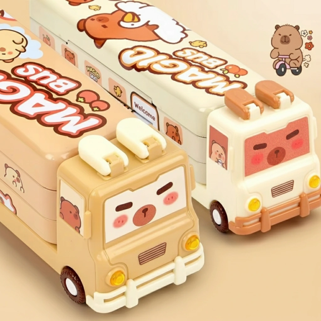 Capybara Magic Bus Pencil Case (2 Styles) – 3-Layer Alloy & PVC Stationery Box with Moving Wheels