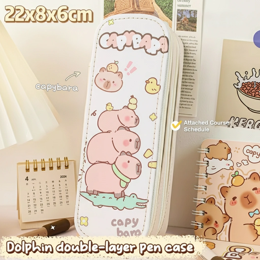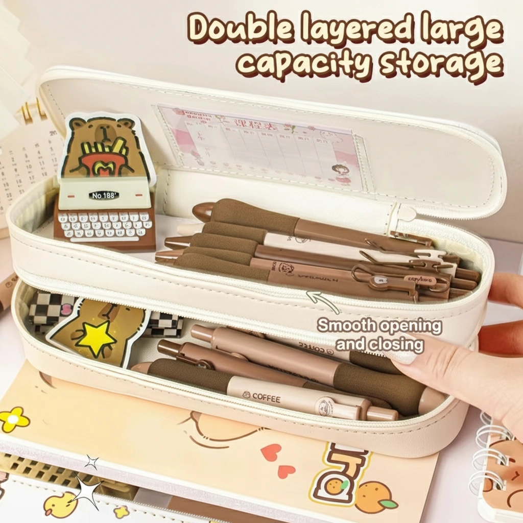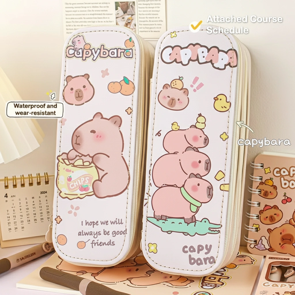 Creamy PU Leather Capybara Pencil Case (4 Styles) – Smooth Waterproof Hard Shell Pouch with Course Schedule