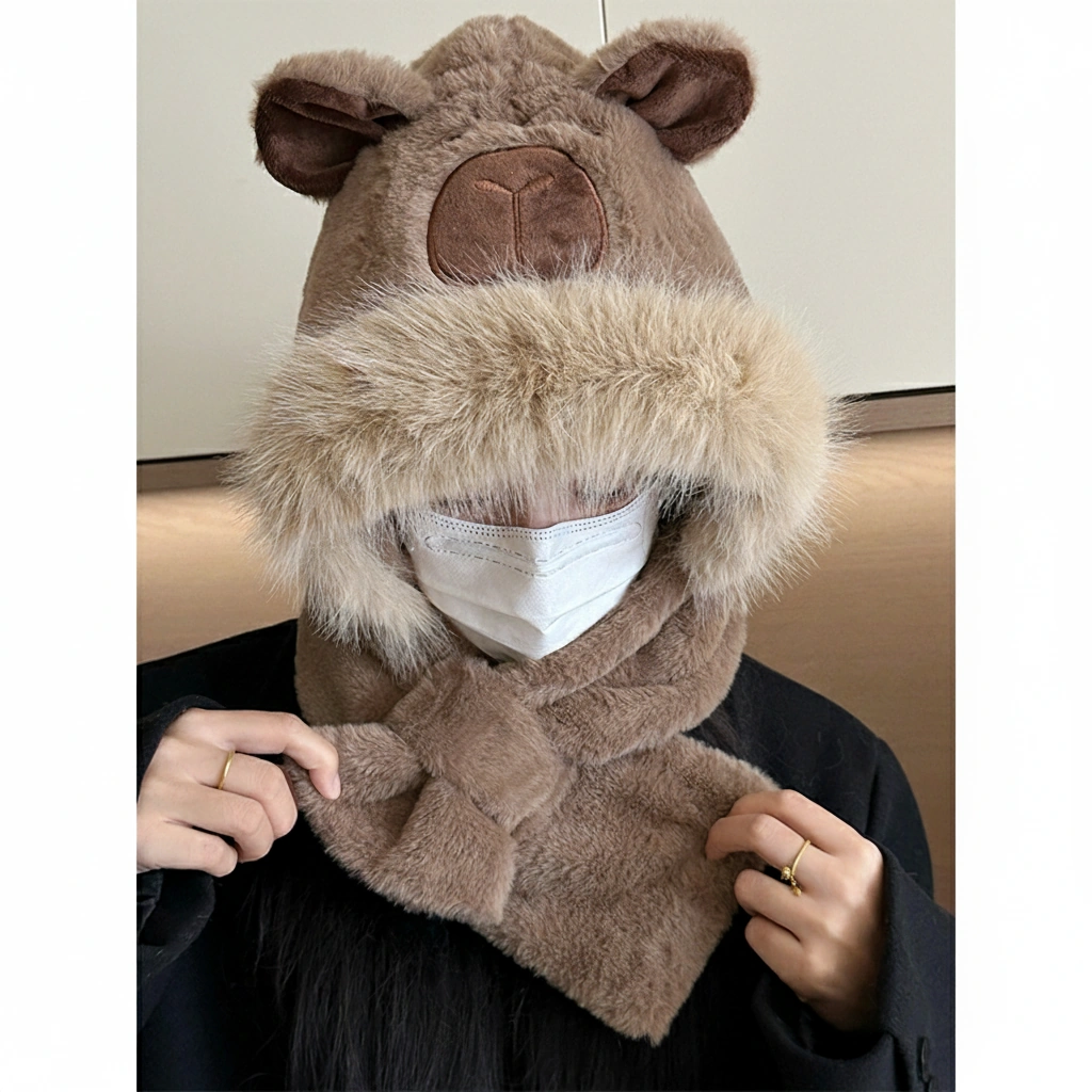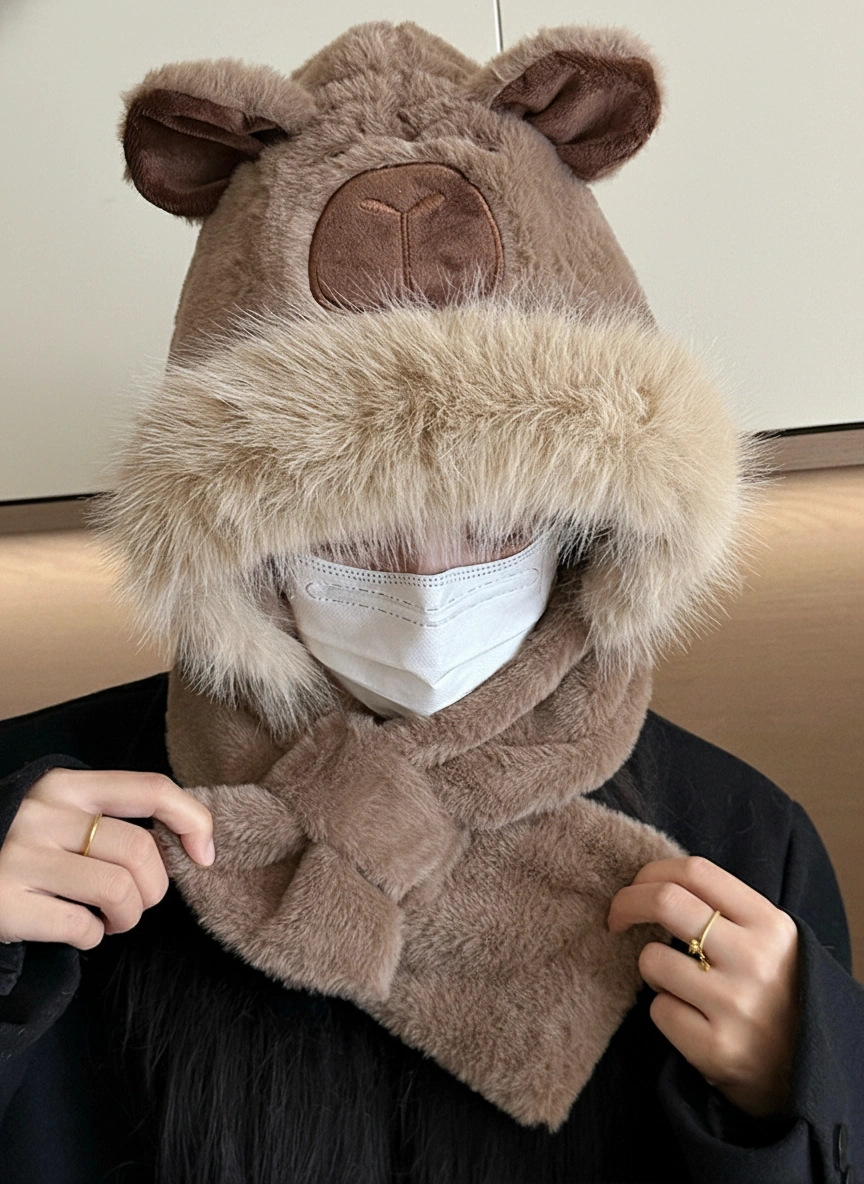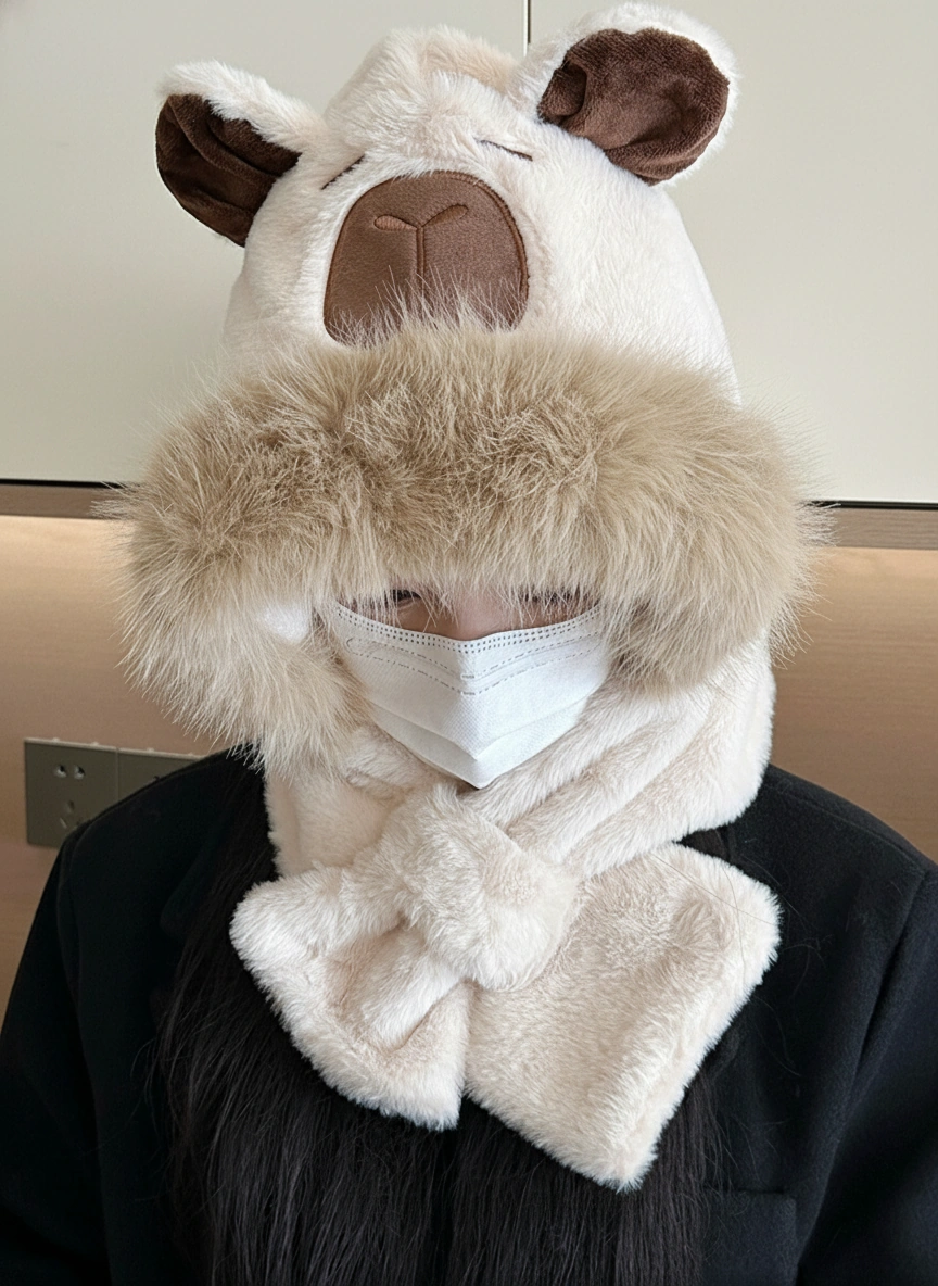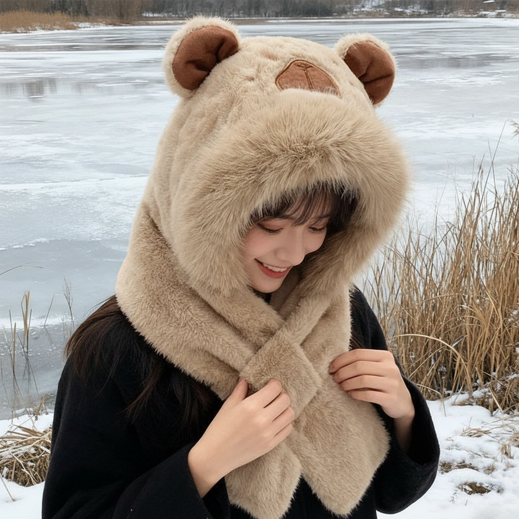 Adult Capybara Hooded Scarf – Thick Faux Fur Trim & Cross-Over Warmer (3 Colors)