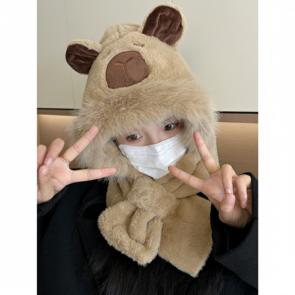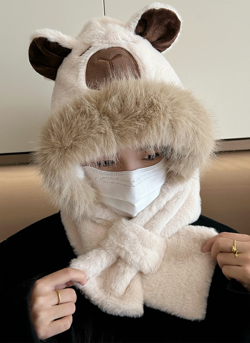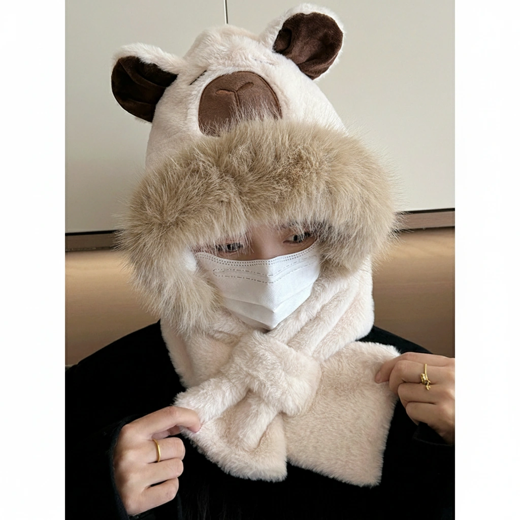 Adult Capybara Hooded Scarf – Thick Faux Fur Trim & Cross-Over Warmer (3 Colors)