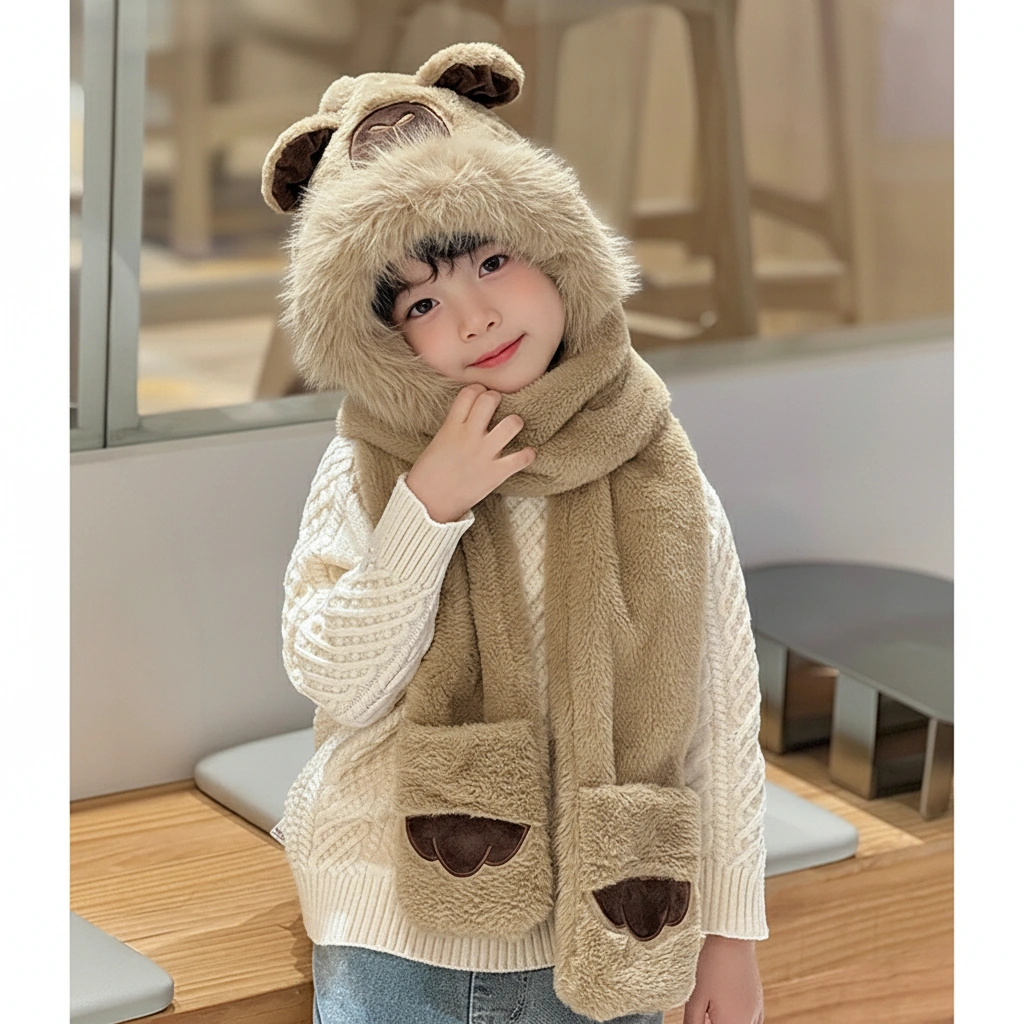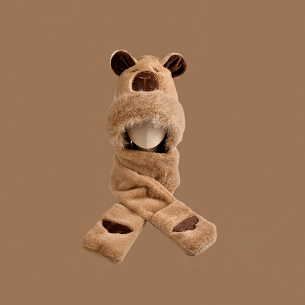 Kids Capybara 3-in-1 Hooded Scarf with Gloves – Faux Fur Trim (3 Colors)