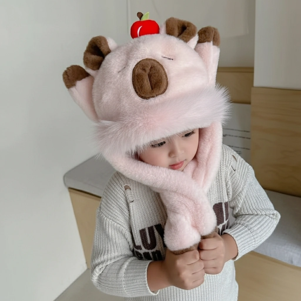 Kids Moving Hand Capybara Plush Hat – 3-in-1 Hooded Scarf with Apple Top (5 Colors)