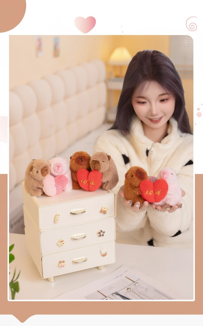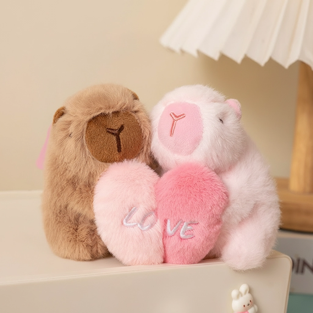 Completed Heart Design Each capybara holds one half of a soft, fuzzy heart. One side is embroidered with “LO” and the other with “VE.” When magnetically attached, the text aligns to spell “LOVE,” completing the puzzle. Even when separated, each plushie looks cute holding its own little red or pink heart pillow.