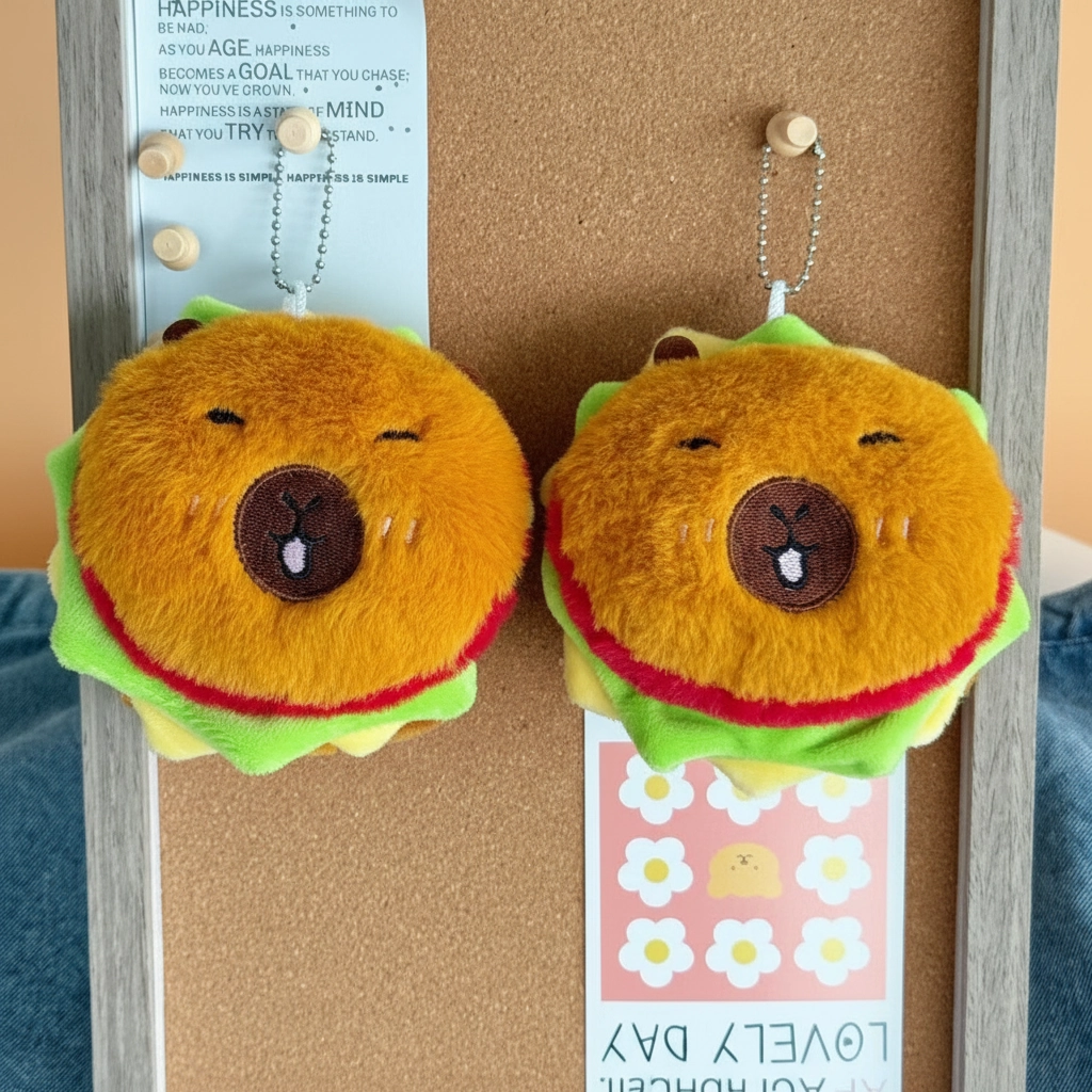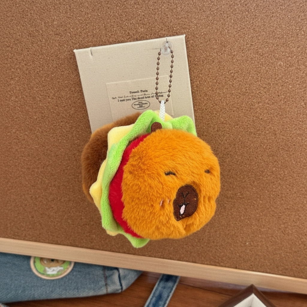 A Tasty Twist on Your Favorite Animal Meet the distinct fusion of food and fun: the Capybara Burger. This isn’t just a standard plush accessory; it’s a creative reimagining of the chill capybara as a delicious-looking hamburger. With its round, fuzzy “bun” face and colorful layers of plush lettuce, cheese, and patty, this item stands out immediately on any backpack or tote bag.