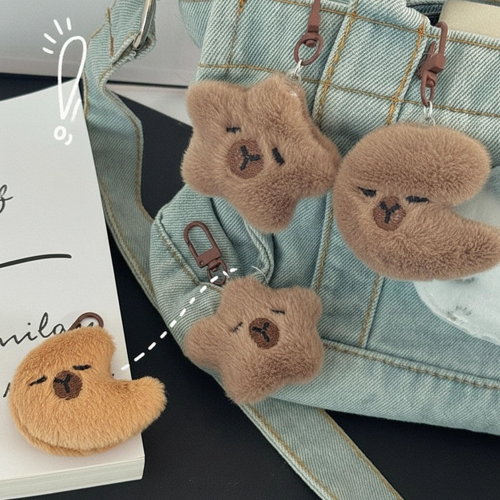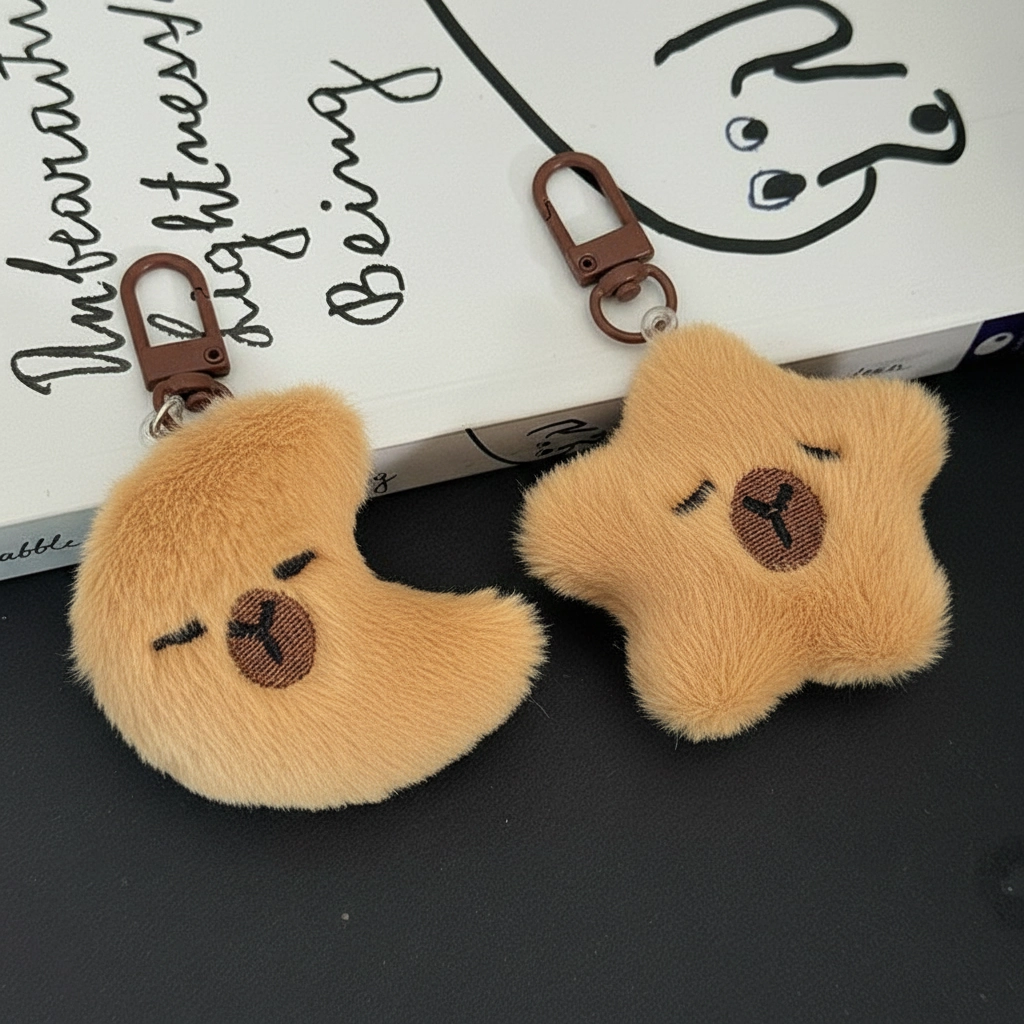 A Dreamy Night Sky Companion Transform your daily accessories with a touch of whimsy from the “Goodnight” collection. In this creative design, the relaxed capybara merges with the symbols of the night sky. Whether shaped like a twinkling star or a gentle crescent moon, these plushies bring a sense of calm and peace to your busy day.