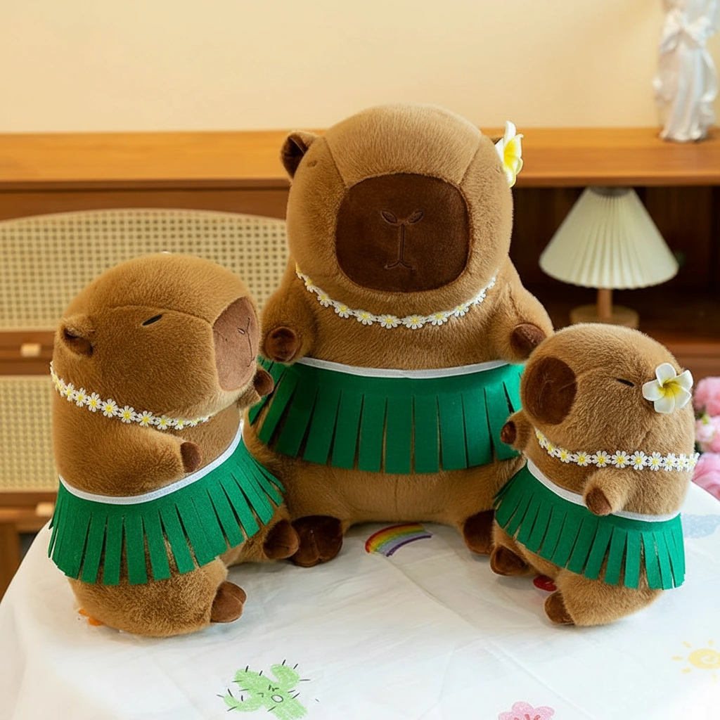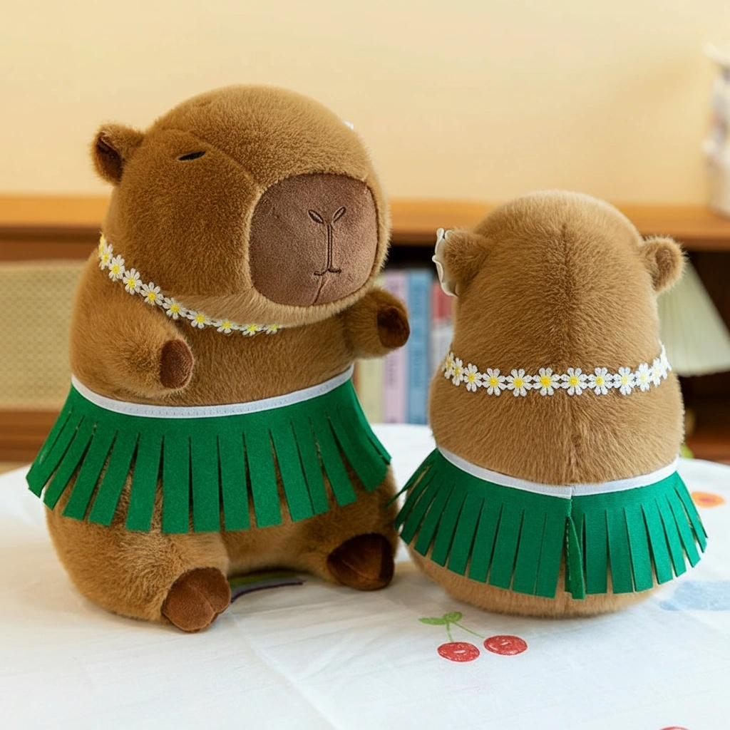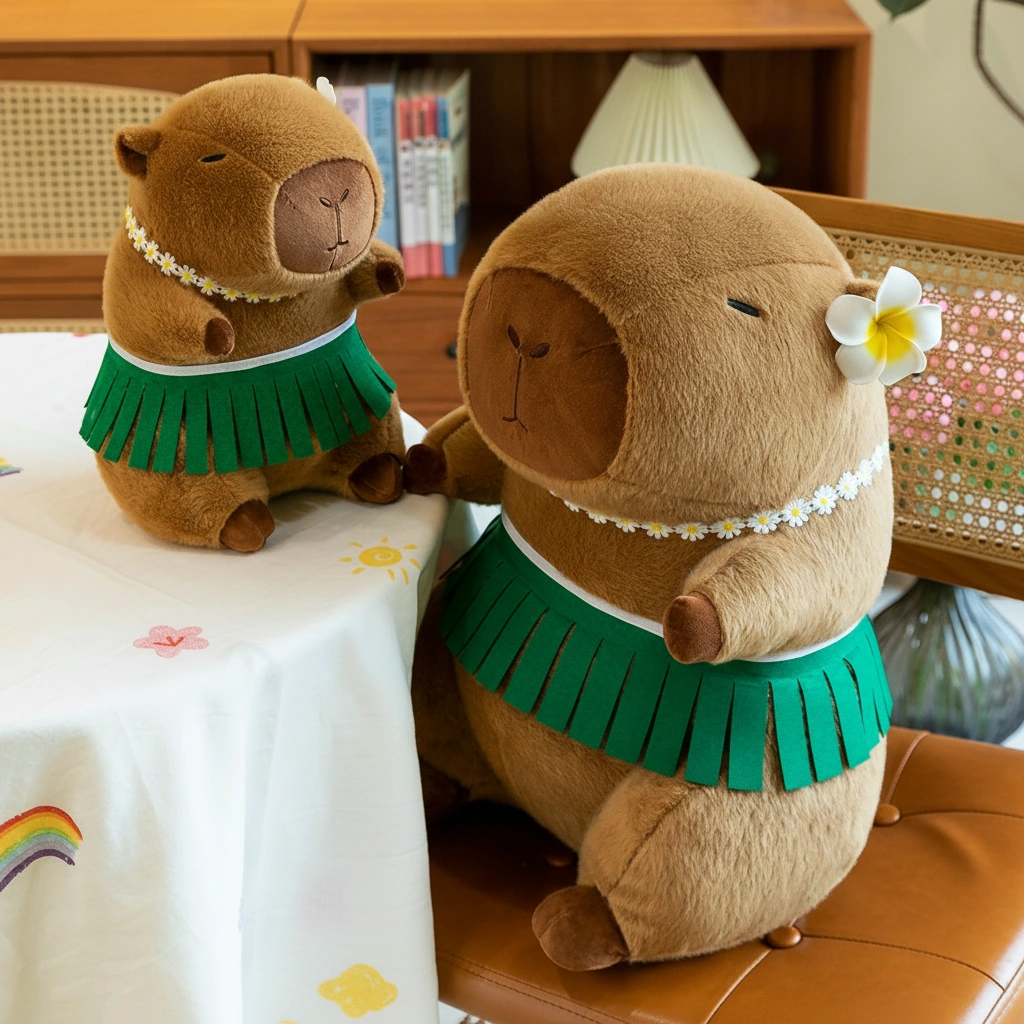Tropical Hula Capybara Plush Toy – Green Grass Skirt & Flower Lei (9″ / 12″ / 16″)