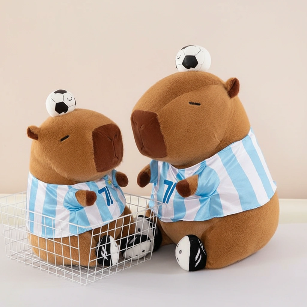 Meet the World’s Chillest Striker Get ready for the cutest match of the season! This isn’t just a stuffed animal; it’s a capybara plush that dreams of winning the World Cup—while taking a nap. Dressed to impress in a classic blue and white striped jersey, this capy is the perfect mascot for football fans and animal lovers alike. Whether you are watching the game or just lounging on the couch, this sporty rodent is ready to be your MVP (Most Valuable Plush).