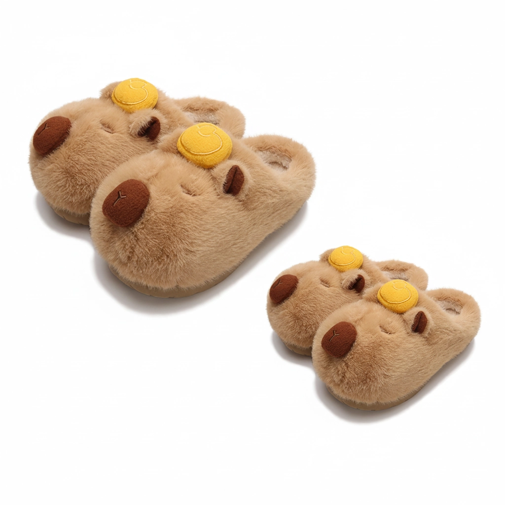 Yuzu Capybara Plush Slippers – Fluffy House Slides with Orange on Head (2 Colors)