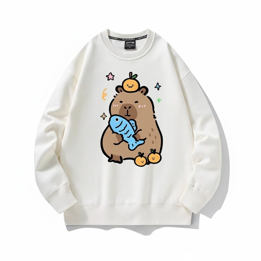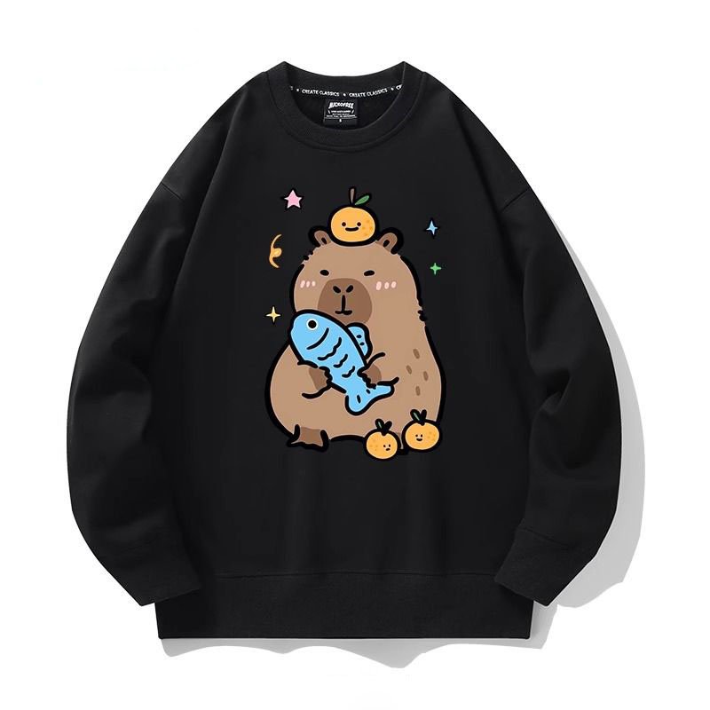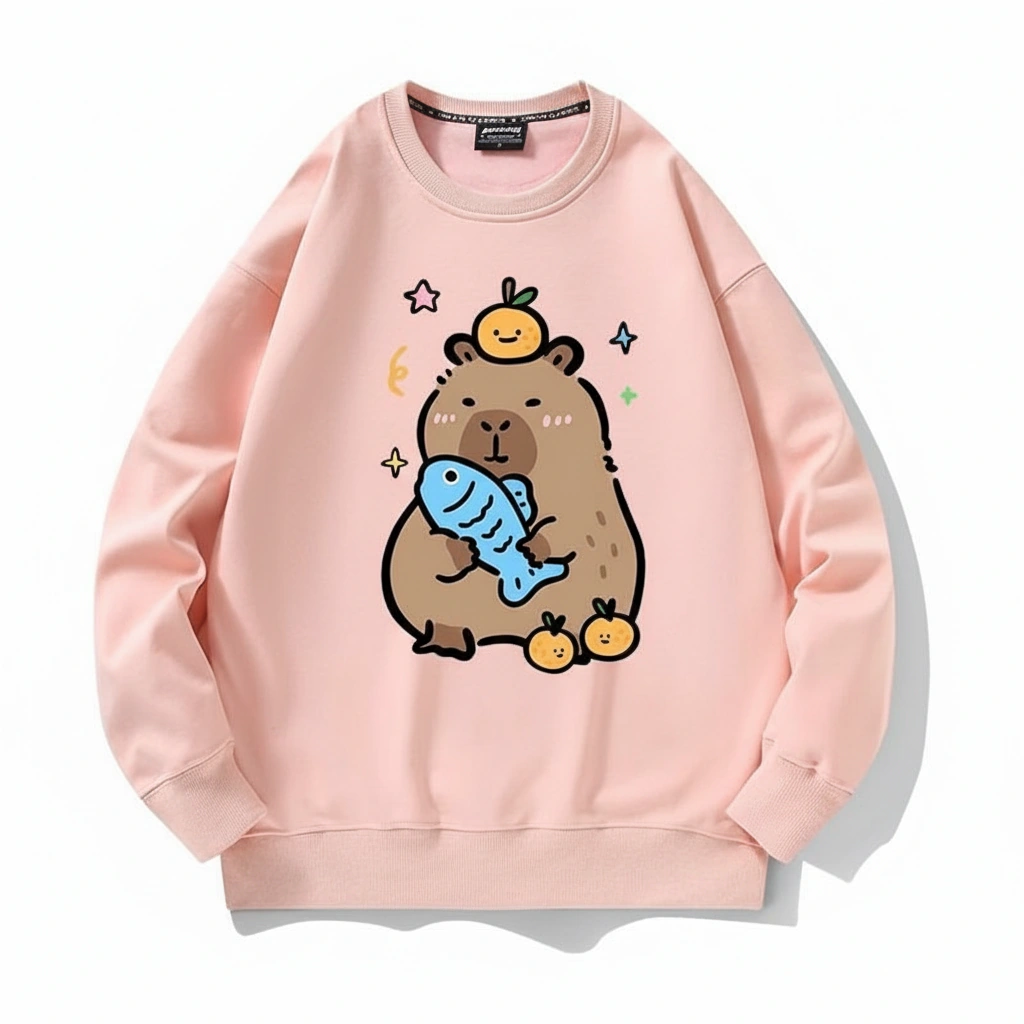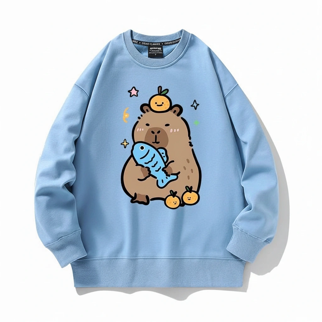 Get hooked on comfort with this incredibly adorable Capybara Sweatshirt. Featuring a capybara who has clearly found its favorite things in life—a plush blue fish and a perfectly balanced yuzu orange—this crewneck is a guaranteed mood booster. It’s the perfect attire for lazy days, cozy nights, or just showing off your love for the world’s friendliest rodent.